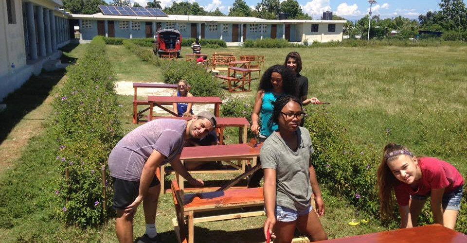 Once the benches were put together, the next phase was sanding them. We were able to hire a local person in the area who came and did that in a matter of a couple days. A few weeks later we had back to back teams from San Diego and Georgia com down. One day of both their trips was spent in the Haitian sun sweating and staining those 20 benches.